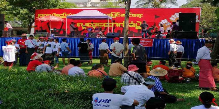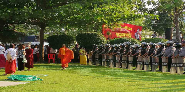 ရန္ကုန္တုိင္း ေတာင္ဥကၠလာပၿမိဳ႕နယ္၊ သုမဂၤလာပန္းၿခံမွာ ဒီကေန႔ ေန႔လယ္ပုိင္း ျပဳလုပ္တဲ့ ဖြဲ႔စည္းပံုျပင္ဆင္ေရးေထာက္ခံ ေဟာေျပာပြဲကုိ မ်ိဳးခ်စ္အဖြဲ႔ဝင္ေတြနဲ႔ မ်ဳိးခ်စ္သံဃာေတြက လာေရာက္ကန္႔ကြက္ခဲ့ၾကတာျဖစ္ၿပီး ရဲတပ္ဖြဲ႔ကလည္း လုံၿခံဳေရး တင္းၾကပ္ထားပါတယ္။