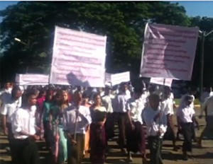 ရခုိင္ျပည္နယ္ စစ္ေတြျမို့မွာ ရခုိင္ေက်ာင္းသားသမဂၢက ဦးေဆာင္ျပီး တကၠသုိလ္္ေက်ာင္းသား၊ ေက်ာင္းသူေတြ လုံျခုံစိတ္ခ်စြာ ပညာသင္ၾကားနုိင္ေရး အပါအ၀င္ အခ်က္ ၅ ခ်က္ကုိ နိုင္ငံေတာ္သမၼတထံ စာေရးေတာင္းဆုိထားတာ အေၾကာင္းမျပန္တဲ့အတြက္ ဒီေန့ လမ္းေလွ်ာက္ခ်ီတက္ျပီး ဆနၵေဖာ္ထုတ္ခဲ့ၾကပါတယ္။