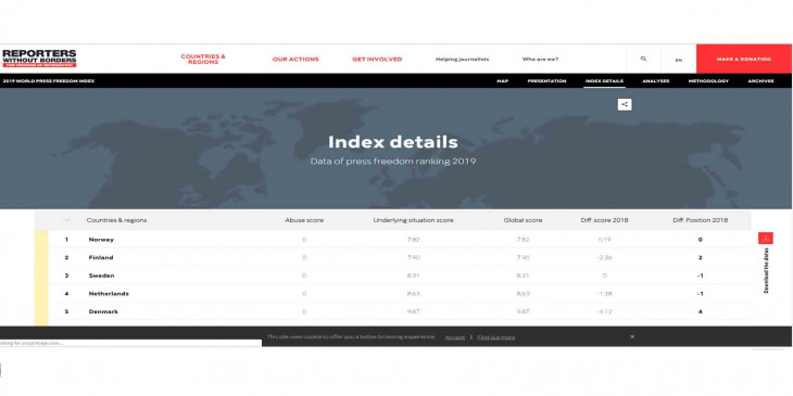 ကမၻာတ၀န္း သတင္းလြတ္လပ္ခြင့္အေျခအေနကို RSF အဖြဲ႔က ႏွစ္စဥ္ ေစာင့္ၾကည့္ ထုတ္ျပန္လိုက္တဲ့ ၂၀၁၉ သတင္းလြတ္လပ္ခြင့္ညြန္းကိန္းမွာ ႏိုင္ငံေပါင္း ၁၈၀ အနက္ ျမန္မာကအဆင့္ ၁၃၈ မွာ ရပ္တည္ေနၿပီး ၂၀၁၈ခုႏွစ္တုန္းကရွိခဲ့တဲ့ အဆင့္ ၁၃၇ ထက္ တဆင့္ ေလ်ာ့ခ်သတ္မွတ္ခံရတာပါ။