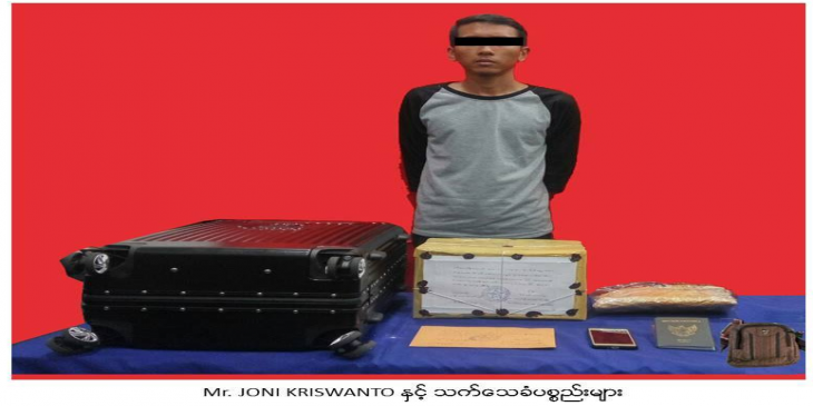 ဧၿပီ ၃ဝ ရက္ ၇ နာရီခြဲေလာက္က မူးယစ္ေဆးဝါးတားဆီးႏွိမ္နင္းေရးရဲတပ္ဖြဲ႔ဝင္ေတြ ပါဝင္တဲ့ ပူးေပါင္းအဖြဲ႔က ရန္ကုန္အျပည္ျပည္ဆိုင္ရာေလဆိပ္ Gate-3 X-Ray စက္မွာ ရွာေဖြ စစ္ေဆးစဥ္ အသက္ ၃၀ အရြယ္ အင္ဒိုနီးရွားႏိုင္ငံသား Mr. JONI KRISWANTO ထံကေန မူးယစ္ေဆးဝါးေတြ ေတြ႕ရွိခဲ့တာပါ။