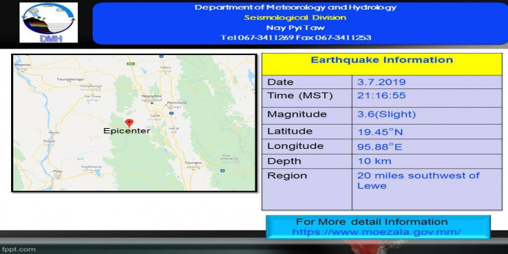 ဇူလိုင္ ၃ ရက္ေန႔ည ၂၁ နာရီ ၁၆ မိနစ္ ၅၅ စကၠန့္အခ်ိန္မွာ လယ္ေ၀းျမိဳ႕ရဲ႕ အေနာက္ေတာင္ဘက္ မိုင္ ၂၀ ခန္႔အကြာ၊ ေျမာက္လတီၱတြဒ္ ၁၉.၄၅ ဒီဂရီ၊ အေရွ႕ေလာင္ဂ်ီတြဒ္ ၉၅.၈၈ ဒီဂရီ၊ အနက္ ၁၀ ကီလိုမီတာခန့္ကို ဗဟိုျပဳ၍ အင္အားရစ္(ခ္)တာစေကး (၃.၆) အဆင့္ရိွ အင္အား အနည္းငယ္ရိွေသာ ေျမငလ်င္တခု လွုပ္ရွားသြားတယ္လုိ႔ ဆုိပါတယ္။
