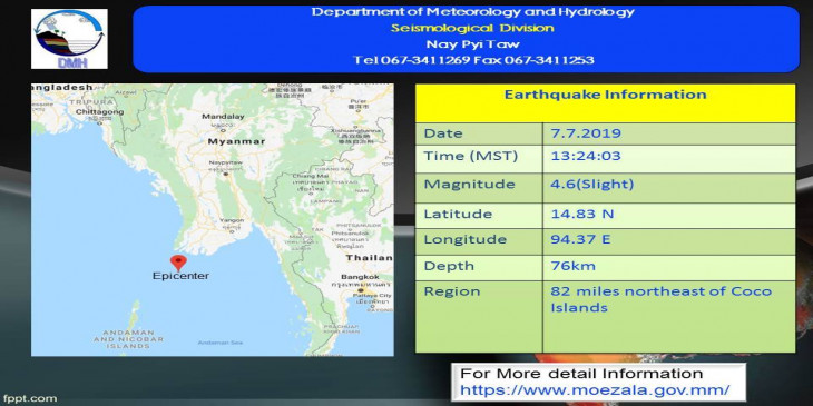 ဇူလိုင္ ၇ ရက္ေန႔၊ ျမန္မာစံေတာ္ခ်ိန္ ၁၃ နာရီ၊ ၂၄ မိနစ္၊ ၀၃ စကၠန္႔အခ်ိန္က ျမန္မာ့ပင္လယ္ျပင္၊ ကိုကိုးကြ်န္းရဲ႕ အေရွ့ေျမာက္ဘက္ ၈၂ မိုင္ ခန့္အကြာ၊ ေျမာက္လတၱီတြဒ္ ၁၄.၈၃ ဒီဂရီ၊ အေရွ႕ေလာင္ဂ်ီတြဒ္ ၉၄.၃၇ ဒီဂရီ၊ အနက္ ၇၆ ကီလိုမီတာကို ဗဟိုျပဳၿပီး အင္အားရစ္(ခ္)တာစေကး ၄.၆ အဆင့္ရိွ အင္အားအနည္းငယ္ရွိ ေျမငလ်င္တခု လႈပ္ရွားသြားတယ္လို႔ ဆုိပါတယ္။