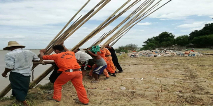 ေရကာတာတည္ေဆာက္ရာမွာ ၿမဳိ႕နယ္ မီးသတ္တပ္ဖြဲ႔ဝင္ေတြနဲ႔ ေဒသခံျပည္သူေတြက ဝါးနဲ႔ ပိုင္ခ်တာ၊ ပိုက္ကြန္တပ္ဆင္တာ၊ သစ္ကိုင္းေတြနဲ႔ သဲအိမ္ထည့္တဲ့လုပ္ငန္းေတြကို ဇူလိုင္လ ၉ ရက္မွ ၁၂ ရက္အထိ ၄ ၾကာတည္ေဆာက္ရမွာျဖစ္တယ္လုိ႔ ၿမိဳ႕နယ္ မီးသတ္ဦးစီး ဦးညီညီေအာင္က ေျပာပါတယ္။