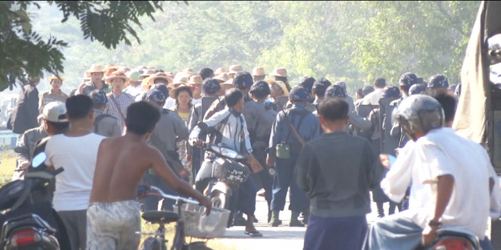 သူတို့ဆနၵကို တင္ျပဖို့ နိုင္ငံေတာ္သမၼတ႐ွိရာ ေနျပည္ေတာ္ကို ခ်ီတက္တဲ့ မိုးထိမိုးမိ ေ႐ြွႊလုပ္သားေတြကို ရမည္းသင္းျမို့ပ်ဥ္းမေတာေက်း႐ြာက ဘုန္းၾကီးေက်ာင္း၀င္းထဲမွာ ေနရာခ်ထားေပးျပီး ရဲတပ္ဖြဲ့၀င္ အင္အားအျပည့္နဲ့ ေစာင့္ၾကည့္ထားပါတယ္။