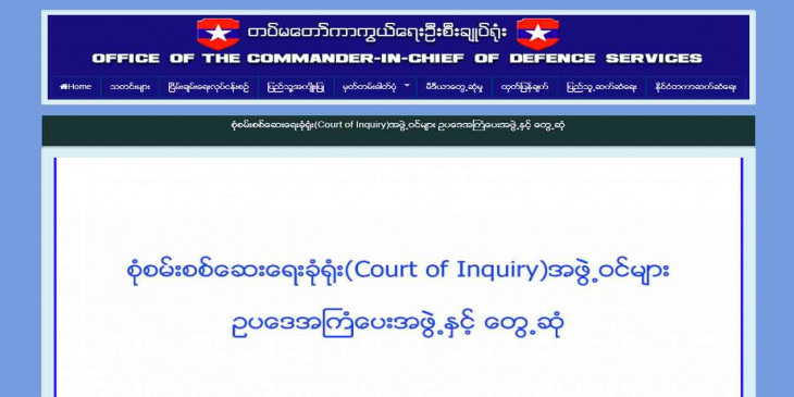 ရခိုင္ျပည္နယ္ ဘူးသီးေတာင္နဲ႔ ေမာင္ေတာေဒသမွာ ျဖစ္ပြားခဲတ့ဲ့ အၾကမ္းဖက္မႈ ျဖစ္စဥ္ေတြနဲ႔ ပတ္သက္ၿပီး ဖြဲ႔စည္းထားတဲ့ စံုစမ္းစစ္ေဆးေရးခံု႐ံုးအဖြဲ႔(Court of Inquiry)ဟာ စစ္ဥပေဒခ်ဳပ္ရံုးမွာ ဥပေဒအႀကံေပးအဖြဲဲ႔ ေတြ႔ဆံုေဆြးေႏြးတယ္လုိ႔ တပ္မေတာ္က သတင္းထုတ္ပါတယ္။