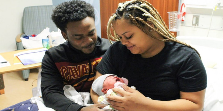 Proud parents Johntez Brown and Rachel Langford holding newborn baby J'Aime Brown.