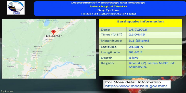 ဇူလိုင္ ၁၄ ရက္ေန႔၊ ျမန္မာစံေတာ္ခ်ိန္ ည ၉ နာရီ၊ ၄ မိနစ္၊ ၄၅ စကၠန္႔ အခ်ိန္မွာ ကသာေျမငလ်င္စခန္းရဲ႕ ေျမာက္ဘက္ ၄၉ မိုင္ ခန္႔ကြာေ၀းတဲ့ ျမန္မာျပည္တြင္း မိုးညႇင္းၿမဳိ႕ရဲ႕ ေျမာက္-အေရွ႕ေျမာက္ဘက္ ၇ မိုင္ခန္႔အကြာ အနက္ ၈ ကီလိုမီတာကို ဗဟိုျပဳၿပီး လႈပ္ခတ္သြားတာလို႔ ဆိုပါတယ္။