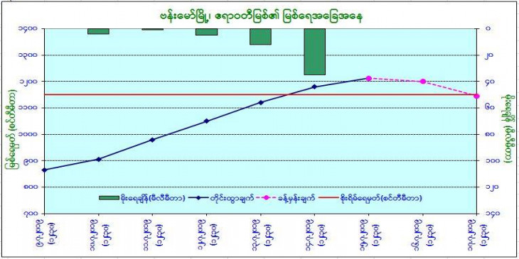 ဒီေန႔ မြန္းလြန္ ၁ နာရီခြဲအခ်ိန္ တိုင္းထြာခ်က္အရ ဧရာဝတီျမစ္ေရဟာ ဗန္းေမာ္ၿမိဳ႕ရဲ႕ စုိးရိမ္ေရမွတ္အထက္ ၂ ေပေလာက္ ေက်ာ္လြန္ေနၿပီး ေနာက္ ၂ ရက္အတြင္း စိုးရိမ္ေရမွတ္ ေအာက္သို႔ ျပန္လည္က်ဆင္းနိုင္ပါတယ္။