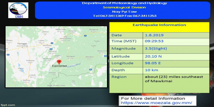ဒီနေ့မနက် ၉ နာရီ ၂၉ မိနစ် ၅၃ စက္ကန့်အချိန်က မောက်မယ်မြို့ရဲ့ အရှေ့တောင်ဘက် ၂၃ မိုင်ခန့်အကွာ မြောက်လတ္တီတွဒ် ၂၀.၁၀ ဒီဂရီ၊ အရှေ့လောင်ဂျီတွဒ် ၉၈.၀၅ ဒီဂရီ၊ အနက် ၁၀ ကီလိုမီတာကို ဗဟိုပြပြီး အင်အားရစ်(ခ်)တာစကေး ၃.၅ အဆင့်ရှိ အင်အားအနည်းငယ်ရှိ မြေငလျင်တခု လှုပ်ခတ်သွားတယ်လို့ ဆိုပါတယ်။