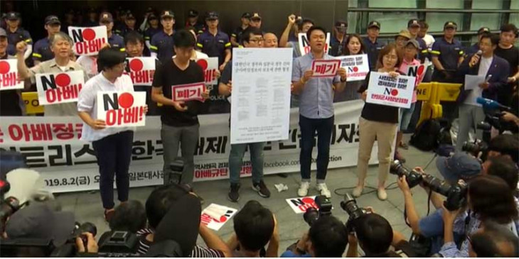 ဂျပန်နိုင်ငံက ကုန်သွယ်ရေး ကန့်သတ်ချက် ကင်းလွတ်ခွင့်ရနိုင်ငံတွေ စာရင်းကနေ တောင်ကိုရီးယားကို ဖယ်ရှားဖို့ အတည်ပြုလိုက်တာကြောင့် သြဂုတ်လ ၂ ရက်နေ့မှာ တောင်ကိုရီးယားနိုင်ငံသားတွေ ဆန္ဒပြခဲ့ကြပါတယ်။