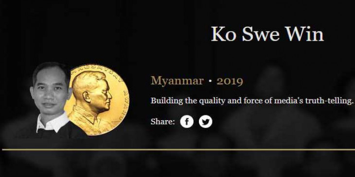 အာရှရဲ့နိုလ်ဆုလို့ တင်စားခေါ်ကြတဲ့ ဖိလစ်ပိုင်နိုင်ငံက ပေးအပ်တဲ့ ၂၀၁၉ ရေမွန်မက်ဆေးဆေးဆုကို မြန်မာနိုင်ငံက Myanmar now သတင်းဌာန အယ်ဒီတာချုပ် ကိုဆွေဝင်းက ရရှိသွားပါတယ်။