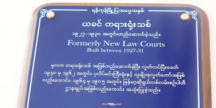 ဒါကြောင့် သမိုင်းတွေကိုကို သိပြီး၊ အနာဂတ်ကို အကောင်းဆုံးပုံဖော်နိုင်ဖို့ဆိုရင် လူငယ်မျိုးဆက်သစ်အတွက် မြို့ပြအမွေအနှစ်တွေကို လက်ဆင့်ကမ်းပေးနိုင်ဖို့လိုအပ်တယ်လို့ သြဂုတ်လ ၄ ရက်နေ့က အရင်က တရားရုံးသစ် အဆောက်အအုံကို Rosewood Yangon အဆောက်အအုံကို အပြာရောင် ကမ္ပည်းပြားတပ်ဆင်တဲ့အခမ်းအနားမှာ ပြောခဲ့တာပါ။