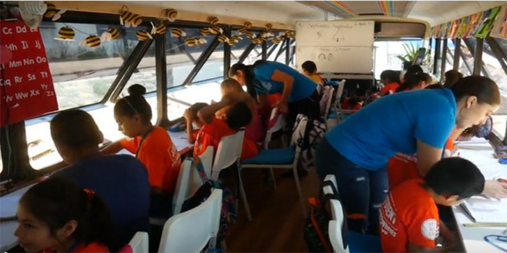 အဲဒီဘတ်စ်ကားကို ရွှေ့ပြောင်းသူများစခန်းအနီးမှာ ပါကင်ထိုးပြီး ဗဟိုအမေရိကနဲ့ မက္ကဆီကန် ကလေးငယ်တွေကို ရှားရှားပါးပါး ပညာသင်ခွင့် ပေးနေပါတယ်။