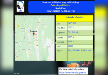 Zawgyi Version နမ့္စန္ၿမိဳ႕နယ္တြင္ ေျမငလ်င္လႈပ္ခတ္ DVB ရွမ္းျပည္နယ္ေတာင္ပိုင္း လြိဳင္လင္ခ႐ိုင္ နမ့္စန္ၿမိဳ႕နယ္မွာ ဒီေန႔မနက္အေစာပိုင္းက ေျမငလ်င္တခု လႈပ္ခတ္သြားတယ္လို႔ မိုးဇလက ထုတ္ျပန္ပါတယ္။ ၾသဂုတ္ ၁၀ ရက္ေန႔ ျမန္မာစံေတာ္ခ်ိန္ ၀၄ နာရီ ၁၃ မိနစ္ ၃၂ စကၠန႔္အခ်ိန္က နမ့္စန္ၿမိဳ႕ရဲ႕ အေရွ႕ေတာင္ဘက္ ၄၁ မိုင္ခန႔္အကြာ၊ ေျမာက္လတၱီတြဒ္ ၂၀.၅၁ ဒီဂရီ၊ အေရွ႕ေလာင္ဂ်ီတြဒ္ ၉၈.၂၁ ဒီဂရီ၊ အနက္ ၂၇ ကီလိုမီတာခန႔္ကို ဗဟိုျပဳ၍ အင္အားရစ္(ခ္)တာစေကး (၃.၅) အဆင့္ရွိ အင္အား အနည္းငယ္ရွိေသာ ေျမငလ်င္တခု လႈပ္ခတ္သြားတယ္လို႔ ဆိုပါတယ္။