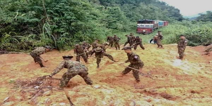 ရေး-ထားဝယ် ပြေးဆွဲနေတဲ့ ရထားလမ်းအပိုင်းမှာ မြေပြိုမှုတွေဖြစ်ပေါ်ခဲ့တဲ့အတွက် ရေးတပ်နယ်က တပ်မတော်သားတွေက မီးရထားလမ်းအမြန် ပြန်လည်ပြေးဆွဲနိုင်ရေးအတွက် လမ်းပိတ်ဆို့မှုတွေကို ရှင်းလင်းနေပါတယ်။