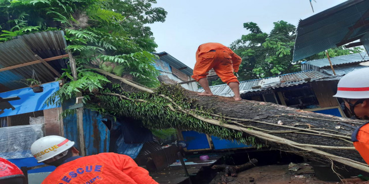 မဂၤလာေတာင္ၫြန႔္တြင္ ေနအိမ္တလုံးေပၚ သစ္ပင္လဲက်ပိမိ (ဓာတ္ပုံ) DVB ရန္ကုန္တိုင္း၊ မဂၤလာေတာင္ၫြန႔္ၿမိဳ႕နယ္၊ ပုသိမ္ၫြန႔္ရပ္ကြက္၊ ဆီစက္ဝန္းလမ္းမွာ ေနအိမ္တလုံးေပၚ သစ္ပင္လဲက်ၿပီး ပိမိေနတာေၾကာင့္ မဂၤလာေတာင္ၫြန႔္ၿမိဳ႕နယ္မီးသတ္စခန္းက မီးသတ္တပ္ဖြဲ႕ဝင္ေတြက ရွင္းလင္းေရး လုပ္ေဆာင္ေပးေနပါတယ္။