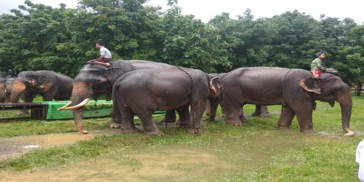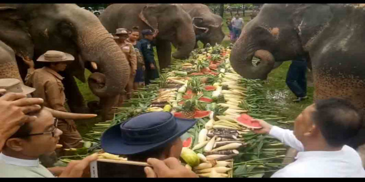 အခမ်းအနားမှာ အသက်အရွယ်အိုမင်းပြီး ထိခိုက်ဒါဏ်ရာတွေကြောင့် နိုင်ငံတာဝန် ထမ်းဆောင်ခြင်းတွေက ရပ်နားထားတဲ့ ဆင်အိုနာ ၅ ကောင်နဲ့ ကွန်ဂျီဆင် ၃ ကောင် စုစုပေါင်း ဆင် ၈ ကောင်ကို သစ်သီးဝလံမျိုးစုံ အစာကျွေးခဲ့ပါတယ်။