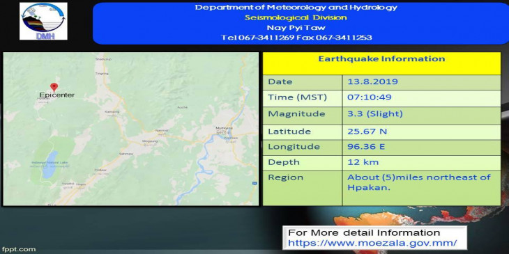 ကခ်င္ျပည္နယ္၊ ဖားကန႔္ၿမိဳ႕အနီးမွာ ၾသဂုတ္ ၁၃ ရက္ မနက္ ၇ နာရီ၊ ၁၀ မိနစ္၊ ၄၉ စကၠန႔္ အခ်ိန္က အင္အားရစ္(ခ္)တာစေကး ၃.၃ အဆင့္ရွိ အင္အားအနည္းငယ္ရွိ ေျမငလ်င္လႈပ္ခတ္သြား တယ္လို႔ မိုးဇလဌာနက သတင္းထုတ္ျပန္ပါတယ္။