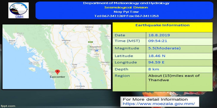 ၾသဂုတ္ ၁၈ ရက္ေန႔၊ ျမန္မာစံေတာ္ခ်ိန္ ၀၉ နာရီ၊ ၅၄ မိနစ္၊ ၂၁ စကၠန႔္အခ်ိန္က သံတြဲၿမိဳ႕ရဲ႕ အေရွ႕ဘက္ ၁၅ မိုင္ခန႔္အကြာ၊ ေျမာက္လတၱီတြဒ္ ၁၈ ဒသမ ၄၆ ဒီဂရီ၊ အေရွ႕ေလာင္ဂ်ီတြဒ္ ၉၄ ဒသမ ၅၉ ဒီဂရီ၊ အနက္ ၈ ကီလိုမီတာကို ဗဟိုျပဳၿပီး အင္အားရစ္(ခ္)တာ စေကး ၅ ဒသမ ၅ အဆင့္ရွိ အင္အားအသင့္အတင့္ရွိေသာ ေျမငလ်င္တခု လႈပ္ခတ္သြားတယ္လို႔ သိရပါတယ္။