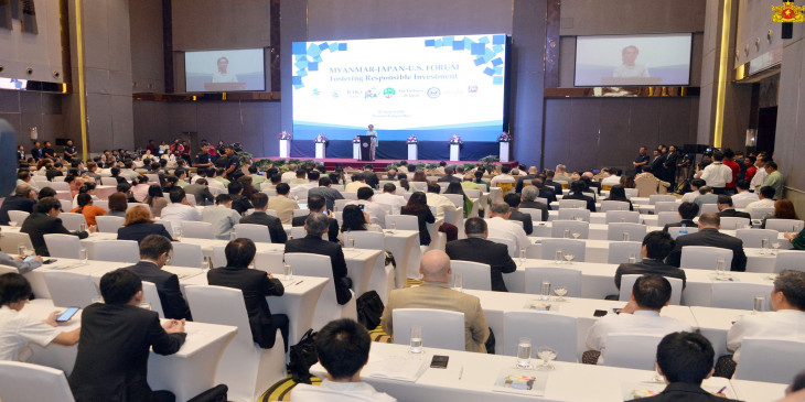 ဩဂုတ္ ၂၀ ရက္က ရန္ကုန္ၿမိဳ႕ ႏိုဗိုတယ္ဟိုတယ္မွာ က်င္းပတဲ့ တာဝန္ယူမႈရွိတဲ့ ရင္းႏွီးျမႇဳပ္ႏွံမႈေတြ ျဖစ္ေပၚ လာေစေရးအတြက္ ျမန္မာ- ဂ်ပန္- အေမရိကန္ ရင္းႏွီးျမႇဳပ္ႏွံမႈ ဖိုရမ္မွာ ေျပာၾကားသြားတာပါ။