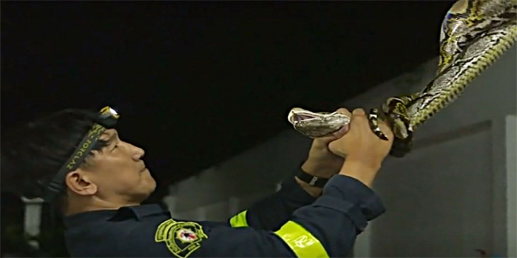 မီးသတ်သမား ပင်န်ယို ဖက်ပင်န်ညိုဟာ ထိုင်းနိုင်ငံ မြို့တော် ဘန်ကောက်က အိမ်တအိမ်မှာ စပါးအုံးမြွေတကောင်ကို ဖမ်းနေပါတယ်။