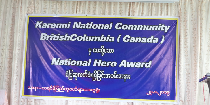 အမျိုးသားဂုဏ်သိက္ခာနဲ့ဆိုင်တဲ့ သမိုင်းဖြစ်ရပ်မှန်အပေါ် ရဲ့ရင့်စွာရပ်တည်ပေးမှုနဲ့ ဗိုလ်ချုပ်ကြေးရုပ် တည်ဆောက်မှုကို ရဲရဲဝံ့ဝံ့ ကန့်ကွက်ခဲ့တဲ့ ကရင်လူငယ်တွေကို ကနေဒါရောက် ကရင်နီအမျိုးသားတွေက National Hero Award စံပြဆုတံဆိပ် ချီးမြှင့်လိုက်ပါတယ်။