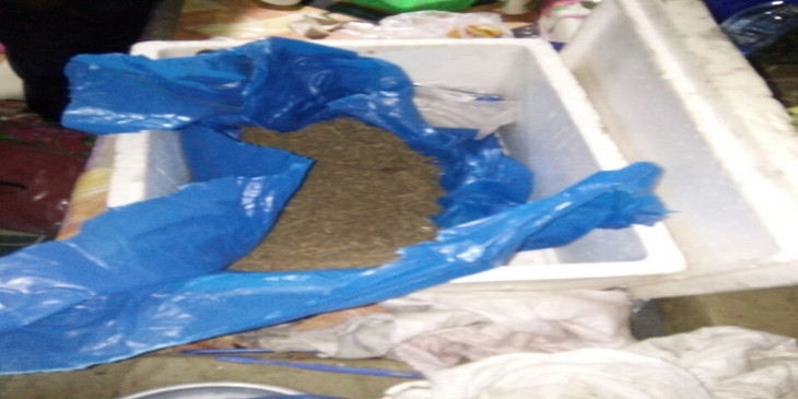 တာဝန်ရှိသူတွေက ဆက်လက်ရှာဖွေရာ အခန်းတွင်း ကွက်ပျစ်အောက်က အာလူးကြော် ဗူးအတွင်း ဆေးခြောက်လို့ယူဆရတဲ့ အရိုး/အရွက်အခြောက်ရောရာ ၈၁.၆၅ ဂရမ်၊ ၅ ကျပ်သားခန့်၊ တန်ဖိုးငွေကျပ် ၄၀၈၂၅ ကျပ်ခန့်အား တွေ့ရှိခဲ့ရပြီး ဆက်လက်ရှာဖွေရာ အိပ်ယာခေါင်းရင်းဘက်မှာ တင်ထားတဲ့ ရေခဲဖော့ဖာအတွင်းက အလေးချိန် ၅၇၁.၅၅ ဂရမ်၊ ၃၅ ကျပ်သားခန့်၊ တန်ဖိုး ၂၈၅၇၇၅ ကျပ်ခန့်၊ စုစုပေါင်း ဆေးခြောက် ၄၀ ကျပ်သားခန့်၊ တန်ဖိုးကျပ် ၃၂၆၆၀၀ ကျပ်ခန့်ကို ဖမ်းဆီးရမိခဲ့ကြောင်း သိရပါတယ်။
