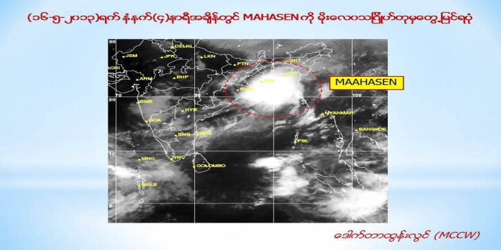 ဒီေန့ နံနက္ ၅း၃၀ နာရီ တုိင္းထြာခ်က္အရ ဘဂၤလားပင္လယ္ေအာ္ေျမာက္ပိုင္းမွာ ျဖစ္ေပၚေနတဲ့ ဆုိင္ကလုန္းမုန္တုိင္းမဟာစင္ (MAHASEN) ဟာ အေ႐ွ့ေျမာက္ဘက္ကုိ ေ႐ြ့လ်ားခဲ့ျပီး ေမာင္ေတာျမို့ရဲ့ အေနာက္-အေနာက္ေတာင္ဘက္မိုင္ ၁၆၀ ခန့္အကြာ ပင္လယ္ျပင္ကို ဗဟိုျပုေနတယ္လို့ ဆုိပါတယ္။