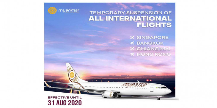 ကိုဗစ်-၁၉ ရောဂါကာကွယ်ဖို့အတွက် မြန်မာအမျိုးသားလေကြောင်း(MNA)ရဲ့ ပြည်ပ လေယာဉ်ခရီးစဉ်တွေဖြစ်တဲ့ စင်ကာပူ၊ ဘန်ကောက်၊ ချင်းမိုင်နဲ့ ဟောင်ကောင်ခရီးစဉ်တွေကို ဇူလိုင် ၃၁ ရက်အထိရပ်ဆိုင်းထားရာမှ ဩဂုတ် ၃၁ ရက်အထိ ထပ်မံတိုးမြှင့် ရပ်ဆိုင်းသွားမယ်လို့ MNA လေကြောင်းလိုင်းက အသိပေး ကြေညာထားပါတယ်။