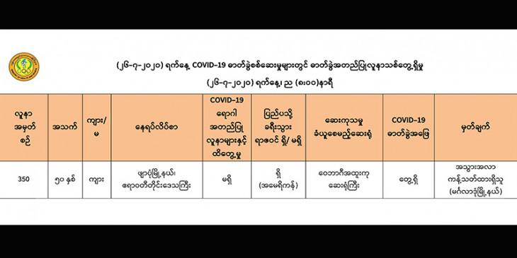 အတည်ပြုလူနာသစ် အမှတ် ၃၅၀ ဟာ အမေရိကန်က ပြန်လာပြီးနောက် မင်္ဂလာဒုံမြို့နယ်မှာ အသွားအလာ ကန့်သတ်ထားတာဖြစ်ပြီး ကိုဗစ်-၁၉ အတည်ပြုလူနာတွေနဲ့ ထိတွေ့မှုမရှိဘူးလို့ ဆိုပါတယ်။ သူ့ကို ဝေဘာဂီအထူးကုဆေးရုံကြီးမှာ ကုသမှုခံယူစေမယ်လို့ ကျန်းမာရေးဝန်ကြီးဌာနက ထုတ်ပြန်ထားပါတယ်။