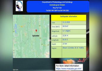 ကချင်ပြည်နယ်၊ အင်ဂျန်းယန်မြို့ရဲ့ တောင်ဘက် ၃ မိုင်ခန့်အကွာမှာ အင်အား ၃ဒသမ ၈ အဆင့်ရှိ မြေငလျင်တခုလှုပ်ခတ်သွားတယ်လို့ မိုးဇလက ထုတ်ပြန်ပါတယ်။