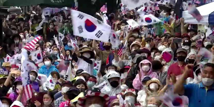 တောင်ကိုရီးယားမြို့တော် ဆိုးလ်မှာ လူစုလူဝေးကို တားမြစ်ထားတဲ့ကြားက သြဂုတ်လ ၁၅ ရက်မှာတော့ ထောင်နဲ့ချီတဲ့ ဆန္ဒပြသူတွေဟာ သမ္မတ မွန်းဂျေအင်းရဲ့ မူဝါဒတွေကို ဆန့်ကျင် ဆန္ဒပြခဲ့ကြပါတယ်။