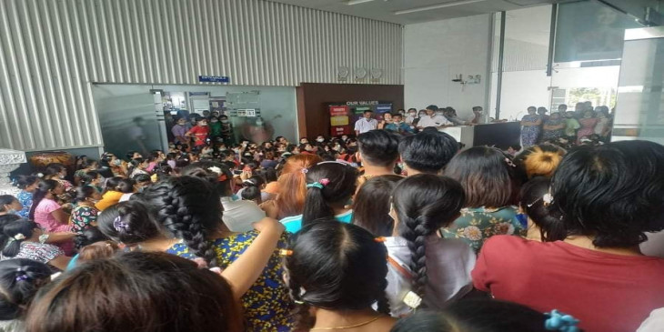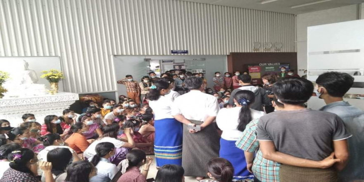 ဧရာဝတီတိုင်း၊ ပုသိမ်မြို့၊ အမှတ် ၁၃ ရပ်ကွက်ရှိ Amava Apparel အထည်ချုပ်စက်ရုံမှာ ကိုဗစ်ကာလ စက်ရုံပိတ်ခဲ့ရတဲ့ ရက်တွေအတွက် နိုင်ငံတော်အစိုးရက ထောက်ပံ့တဲ့ လူမှုဖူလုံကြေးငွေ အပြည့်အဝရရှိရေး အလုပ်သမားတွေက တောင်းဆိုပါတယ်။