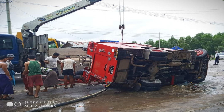 ဧရာဝတီတိုင်း၊ ပုသိမ်မြို့၊ အမှတ် ၁၅ ရပ်ကွက် ရန်ကုန်-ပုသိမ်ကားလမ်းမကြီးဘေးမှာ ဩဂုတ် ၂၅ ရက်က မီးသတ်ကား ၁ စီး အရှိန်လွန် တိမ်းမှောက်ပြီး အိမ်စီးကားကို ဝင်တိုက်မိခဲ့လို့ လူ ၂ ဦးဒဏ်ရာရသွားပါတယ်။