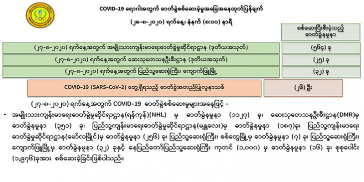 အမျိုးသားကျန်းမာရေးဓာတ်ခွဲမှုဆိုင်ရာဌာန (ရန်ကုန်) က ဓာတ်ခွဲနမူနာ ၅၆၄ ခု၊ ဆေးသုတေသနဦးစီးဌာနက ၂၅ ခုနဲ့ ပြည်သူ့ဆေးရုံကြီး ကျောက်ဖြူမြို့က ၃၂ ခု၊ စုစုပေါင်း ၆၂၁ ခုအား စစ်ဆေးခဲ့ပြီး လူနာသစ် ၂၆ ဦး တွေ့ရှိခဲ့တာပါ။
