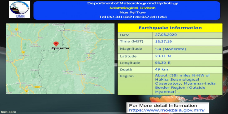 သြဂုတ် ၂၇ ရက်နေ့၊ မြန်မာစံတော်ချိန် ၁၈ နာရီ၊ ၃၇ မိနစ်၊ ၁၉ စက္ကန့်အချိန်မှာ မြန်မာနိုင်ငံပြည်ပ (Myanmar-India Border Region)၊ မြောက်လတ္တီတွဒ် ၂၃.၁၁ ဒီဂရီ၊ အရှေ့လောင်ဂျီတွဒ် ၉၃.၃၀ ဒီဂရီ၊ အနက် ၄၉ ကီလိုမီတာကို ဗဟိုပြုပြီး အင်အားရစ်(ခ်)တာ စကေး ၅.၄ အဆင့်ရှိ အင်အားအသင့်အတင့်ရှိသော မြေငလျင်တခု လှုပ်ရှားသွားပါတယ်။