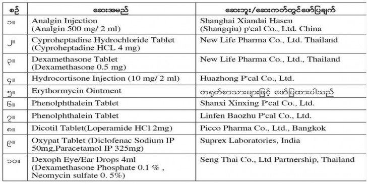 တရုတ္ႏိုင္ငံ Shanghai Xiandai Hasen ကုမၸဏီထုတ္ Analgin Injection ေဆး၊ Huazhong P’cal ကုမၸဏီထုတ္ Hydrocortisone Injection, တရုတ္စာသားေတြနဲ႔ေဖာ္ျပထားတဲ့ Erythormycin Ointment ေဆး၊ Shanxi Xinxing P’cal ကုမၸဏီနဲ႔ Linfen Baozha P’cal ကုမၸဏီထုတ္ Phenolphthalein Tablet တို႔ပါ၀င္ပါတယ္။