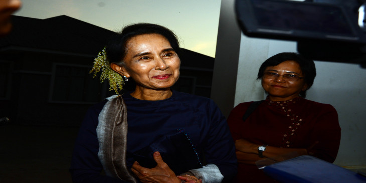 သမၼတႏွင့္ နုုိင္ငံေရးပါတီမ်ား ေဆြးေႏြးပဲြအၿပီး ေဒၚေအာင္ဆန္းစုၾကည္ သတင္းမီဒီယာႏွင့္ေတြ႔ဆံု