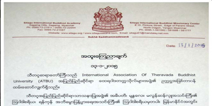 အျပည္ျပည္ဆိုင္ရာ ေထရ၀ါဒ တကၠသိုလ္မ်ားအဖြဲ႔ဥကၠ႒ သီတဂူဆရာေတာ္ဘုရားႀကီး အဂၢမဟာပ႑ိတ အရွင္ဉာဏိႆ ရဟာ သီတဂူအျပည္ျပည္ဆိုင္ရာ သာသနာျပဳအဖဲြ႔ရဲ႕ အဓိပတိ၊ မႏၱေလး မလြန္ဆန္လွဴအသင္းႀကီးရဲ႕ ၾသ၀ါဒစရိယမွတပါး ျမန္မာႏိုင္ငံတြင္း တျခားေသာ မည္သည့္ ဘာသာေရးအသင္းအဖြဲ႔၊ လူမႈေရးအဖြဲ႔၊ ႏိုင္ငံေရးအဖြဲ႕ စသည္ေတြ မွာ ဥကၠ႒၊ ဒု-ဥကၠ႒၊ အတြင္းေရးမႉးအျဖစ္ တာ၀န္ထမ္းေဆာင္ျခင္းမရွိေၾကာင္း သီတဂူ ကမၻာ့ဗုဒၶတကၠသိုလ္ရဲ႕ စီမံအုပ္ခ်ဳပ္ေရးအဖြဲ႔က မေန႔က ထုတ္ျပန္ေၾကညာပါတယ္။