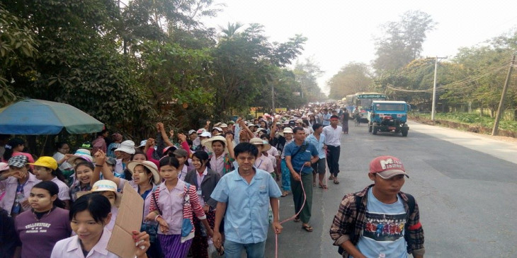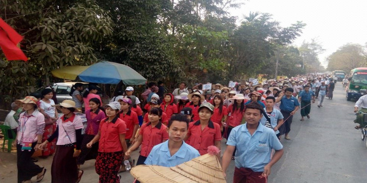 အထည္ခ်ဳပ္စက္ရုံက အလုပ္သမားေတြဟာ ၿပီးခဲ့တဲ့ ဇန္န၀ါရီလ ၂၈ ရက္ေန႔ကတည္းက ေတာင္းဆုိ ဆႏၵျပ ေနၾကတာျဖစ္ၿပီး အခု ခ်ီတက္လွည့္လည္ ဆႏၵျပေနၾကတာျဖစ္ပါတယ္။