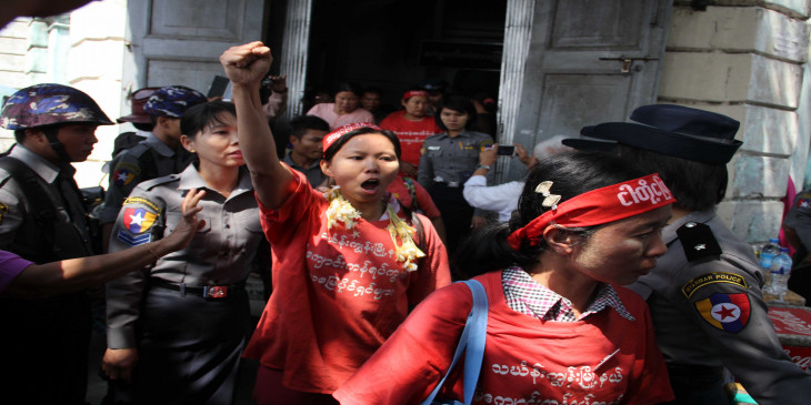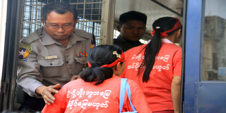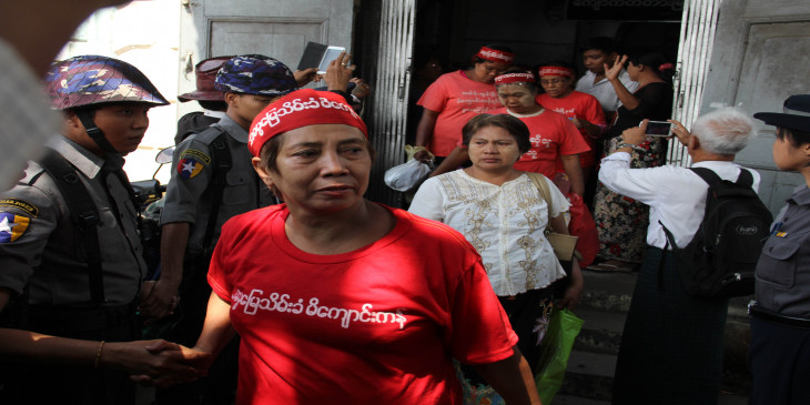 ေထာင္ခ်ခံရတဲ့ ၁၄ ေယာက္ထဲမွာ ၁၂ ေယာက္က အမ်ဳိးသမီးေတြျဖစ္ပါတယ္။ ရန္ကုန္ ၿမိဳ႕ေတာ္ခန္းမအ၀င္လမ္းမွာဖြင့္လွစ္ထားတဲ့ သပိတ္စခန္းကုိ ၿပီးခဲ့တဲ့ ဒီဇင္ဘာလ ၂၃ ရက္ေန႔မွာ အာဏာပုိင္ေတြက သြားေရာက္သိမ္းဆည္းၿပီး ၁၄ ဦးကုိ ဖမ္းဆီးခဲ့ပါတယ္။