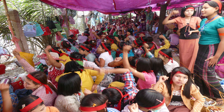 လႈိင္သာယာ စက္မႈုဇုန္ရွိ တုုိင္ရီ ဖိနပ္စက္ရုုံ အလုုပ္သမားေတြ လုပ္ခလစာတုိးျမႇင့္ေပးေရး ေဖေဖာ္၀ါရီလ ၁၈ ရက္ေန႔က ဆႏၵထုုတ္ေဖာ္ၾကစဥ္။