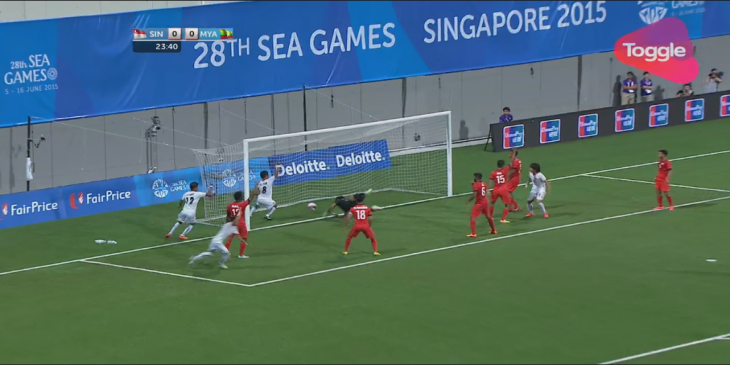 ၂၃ မိနစ္မွာ စင္ကာပူအသင္းက ေထာင့္ကန္ေဘာရရွိၿပီး ကန္တင္လုိ႔ ေခါင္းတုိက္သြင္းရာမွာ ဂုိးလြန္ေဘာျဖစ္သြားခဲ့ပါတယ္။