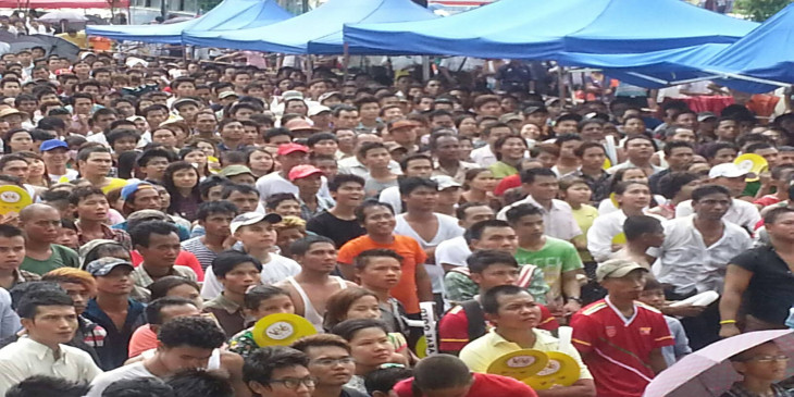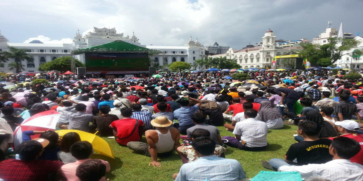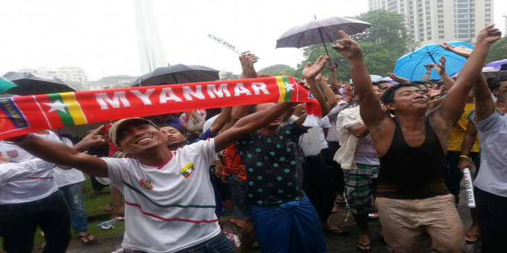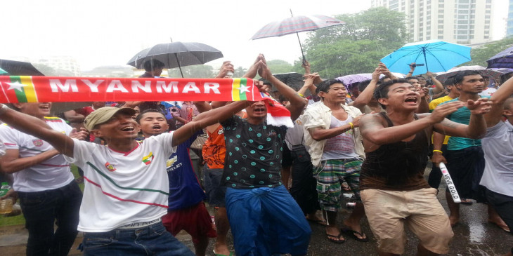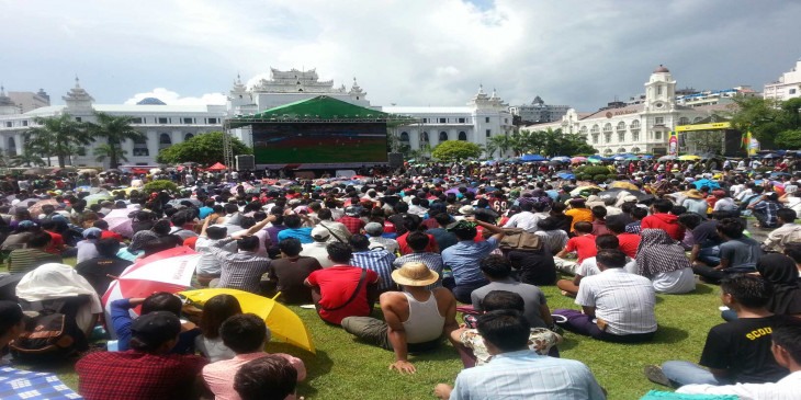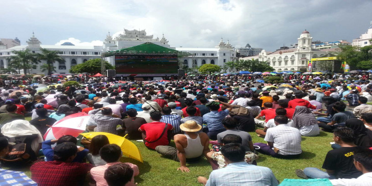 ရန္ကုန္ၿမိဳ႕ေတာ္ခန္းမေရွ႕ ျမန္မာေဘာလုံးပရိသတ္မ်ား။