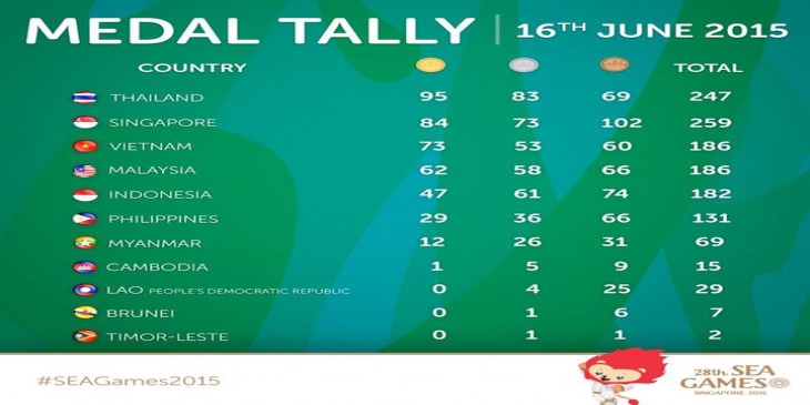 အာဆီယံ ႏိုင္ငံေပါင္း ၁၁ ႏိုင္ငံ ယွဥ္ၿပုိင္တဲ့ ဒီၿပဳိင္ပြဲမွာ ထိုင္းက ေရႊတံဆိပ္ေပါင္း ၉၅ ခုနဲ႔ ေရႊတံဆိပ္အမ်ားဆံုးရၿပီး အိမ္ရွင္ စင္ကာပူက ေရႊ ၈၄ ခုနဲ႔ ဒုတိယ၊ ဗီယက္နမ္က ေရႊတံဆိပ္ ၇၃ ခုနဲ႔ တတိယ ေနရာက အသီးသီး ရပ္တည္ေနပါတယ္။